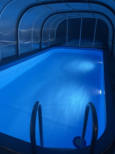 A kertben nyitható tetejű nagyméretű ÚSZÓMEDENCE (8 m x 3,5 m x 1,5 m) található.